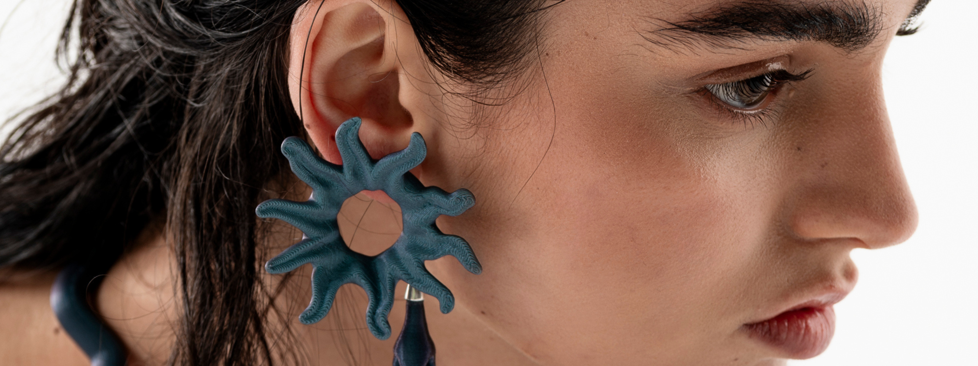 Each jewel, carefully crafted by 3D printed, captures the essence of sustainability and vegan fashion. With organic shapes that mimic the beauty of sea urchins and colors that evoke the serenity of the ocean, this collection represents the harmony between the modern and the traditional.